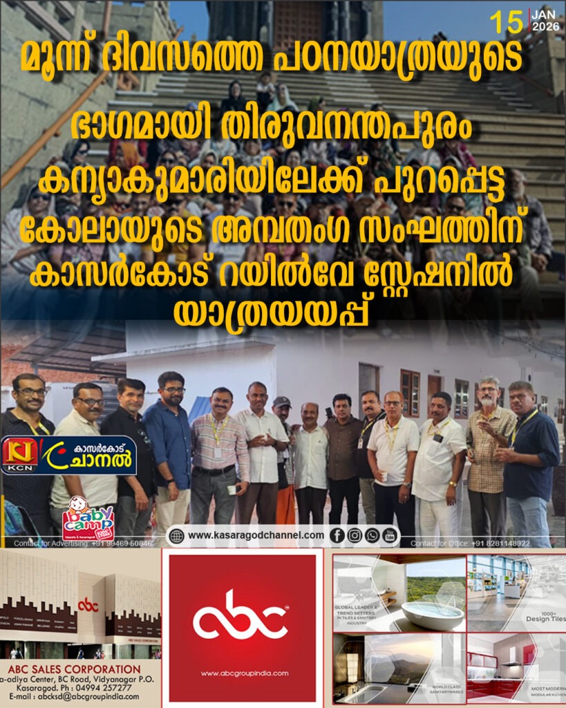മൂന്ന് ദിവസത്തെ പഠനയാത്രയുടെ ഭാഗമായി തിരുവനന്തപുരം , കന്യാകുമാരിയിലേക്ക് പുറപ്പെട്ട കോലായുടെ അമ്പതംഗ സംഘത്തിന് കാസര്കോട് റയില്വേ സ്റ്റേഷനില് യാത്രയയപ്പ് .പുതുതായി തെരഞ്ഞെടുക്കപ്പെട്ട കാസര്കോട് മുനിസിപല് വൈസ്