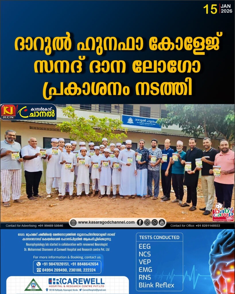 ദാറുല് ഹുനഫാ കോളേജ് സനദ് ദാന ലോഗോ പ്രകാശനം നടത്തി കാസര്ഗോഡ് നെല്ലിക്കുന്ന് മുഹിയുദ്ദീന് ജുമാഅത്ത് പള്ളിയുടെ കീഴിലുള്ള ദാറുല് ഹുനഫാ കോളേജ് സനദ് ദാന ചടങ്ങ്