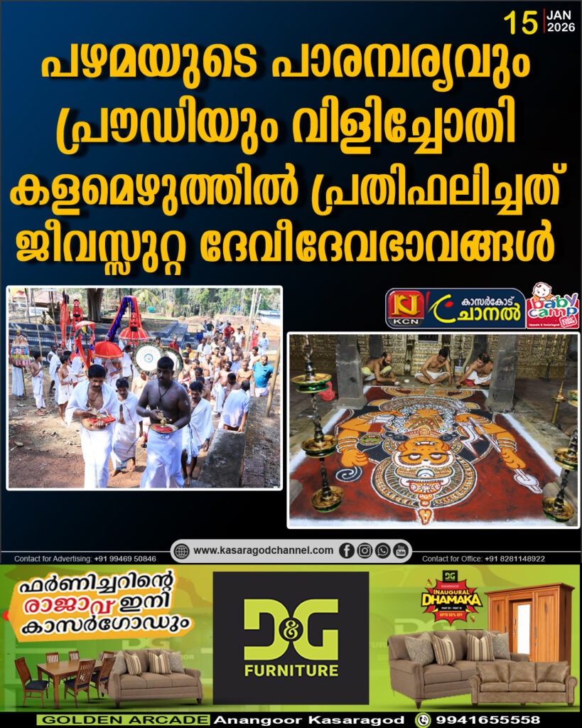 പഴമയുടെ പാരമ്പര്യവും പ്രൗഡിയും വിളിച്ചോതി കളമെഴുത്തില് പ്രതിഫലിച്ചത് ജീവസ്സുറ്റ ദേവീദേവഭാവങ്ങള് കാഞ്ഞങ്ങാട് ശ്രീ മഡിയന് കൂലോം പാട്ടുത്സവത്തില് പാരമ്പര്യവും പഴമയുടെ പ്രൗഡിയും വിളിച്ചോതി കളമെഴുത്ത് ചടങ്ങ്. പാട്ടുത്സവ