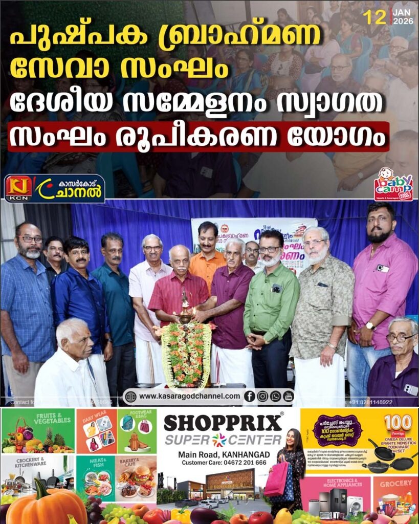 കാസറഗോഡ് –പുഷ്പക ബ്രാഹ്മണ സേവാ സംഘം -ദേശീയ സമ്മേളനം സെപ്തംബര് മാസം 12 ,13 തിയ്യതികളാലായി കാസറഗോഡ് നടക്കും.ഇതിന്റെ സ്വാഗത സംഘം രൂപീകരണ യോഗം കാസറഗോഡ് താളിപടപ്പു