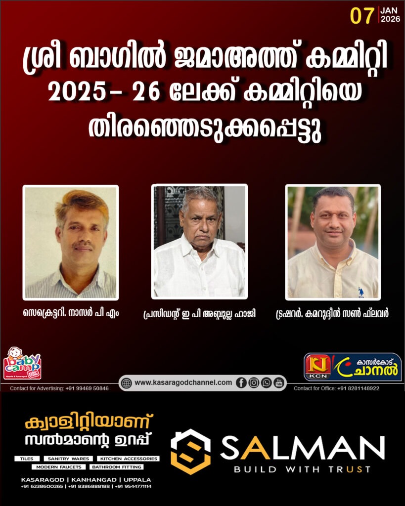 കാസര്കോട്. ശ്രീ ബാഗില് ജമാഅത്ത് കമ്മിറ്റി 2025- 26 ലേക്ക് കമ്മിറ്റിയെ തിരഞ്ഞെടുക്കപ്പെട്ടു. ഖത്തിബ് ശുഹൈല് ഫാസിലി ദുആ യോടു കൂടി നടന്ന പരിപാടിയില് ജമാഅത്ത് പ്രസിഡണ്ട്