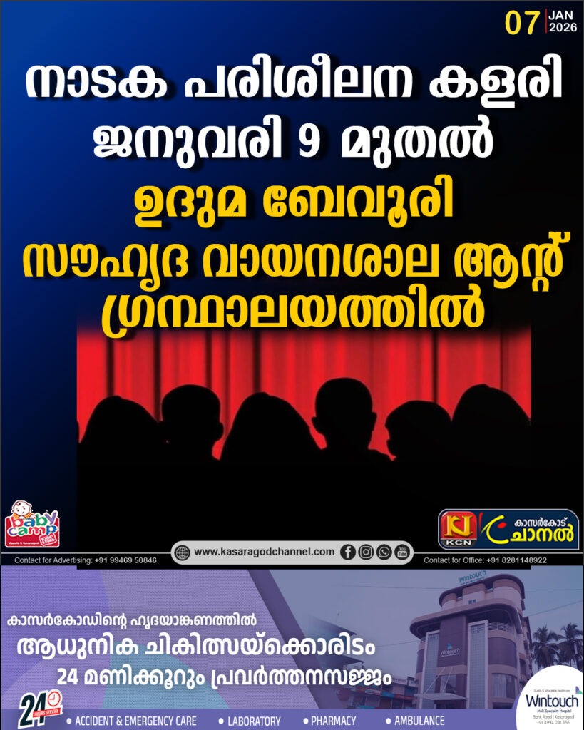 നാടക പരിശീലന കളരി ജനുവരി 9 മുതല് ഉദുമ ബേവൂരി സൗഹൃദ വായനശാല ആന്റ് ഗ്രന്ഥാലയത്തില് കാസര്കോട് ജില്ല ലൈബ്രറി കൗണ്സിലിന്റെ അഭിമുഖ്യത്തിലുള്ള നാടക പരിശീലന കളരി