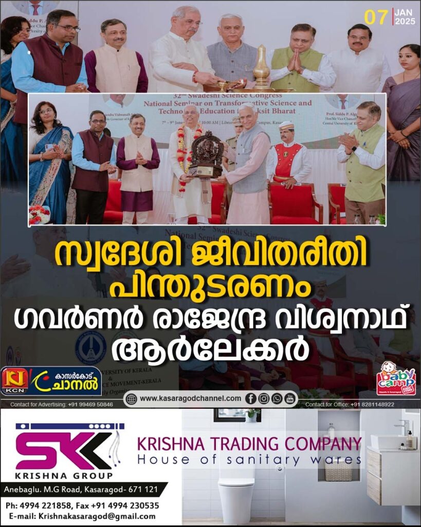 പെരിയ: ശാസ്ത്രീയമായ ജീവിതരീതി അനിവാര്യതയാണെന്നും സ്വന്തം ദേശത്തിന്റെ ജീവിതരീതികള് പിന്തുടരണമെന്നും കേരള ഗവര്ണര് രാജേന്ദ്ര വിശ്വനാഥ് ആര്ലേക്കര്. കേരള കേന്ദ്ര സര്വകലാശാലയും സ്വദേശി ശാസ്ത്ര പ്രസ്ഥാനം –
