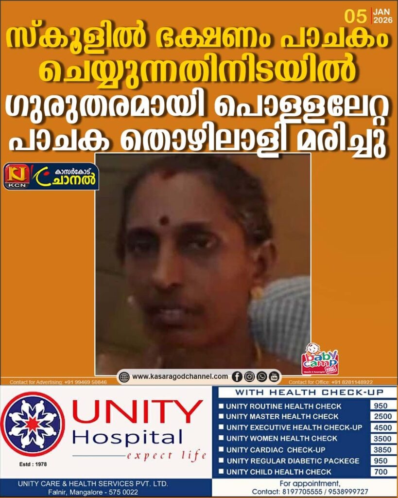 സ്കൂളില് ഭക്ഷണം പാചകം ചെയ്യുന്നതിനിടയില് സ്റ്റൗവില് നിന്ന് പടര്ന്ന് ഗുരുതരമായി പൊള്ളലേറ്റ പാചക തൊഴിലാളി മരിച്ചു. മഞ്ചേശ്വരം ഗവണ്മെന്റ് സ്കൂളിലെ പാചക തൊഴിലാളിയായ ഉദ്യാവര് മാടായിലെ ജയ(56)