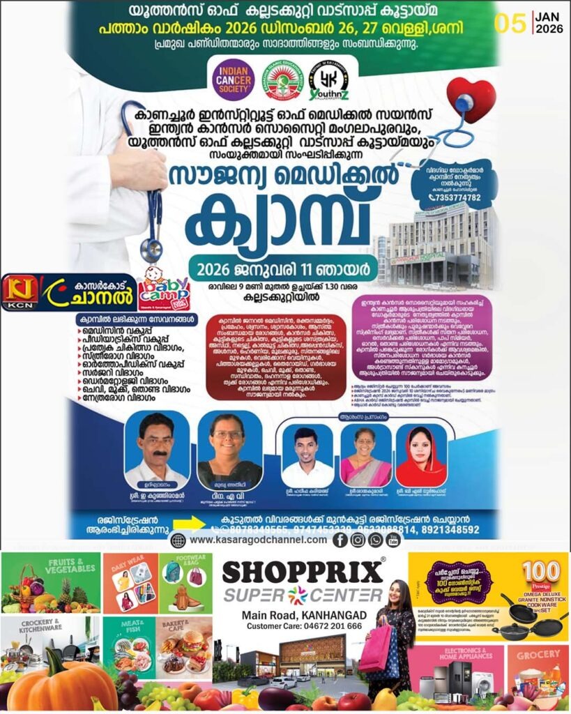 കാണച്ചൂര് മെഡിക്കല് ഇന്സ്റ്റിറ്റ്യൂട്ട് ഓഫ് മെഡിക്കല് സയന്സ്, ഇന്ത്യന് കാന്സര് സൊസൈറ്റി മംഗലാപുരവും, യൂത്തന്സ് ഓഫ് കല്ലടക്കുറ്റി വാട്സാപ്പ് കൂട്ടായ്മയും സംയുക്തമായി സംഘടിപ്പിക്കുന്ന സൗജന്യ മെഡിക്കല് ക്യാമ്പ്