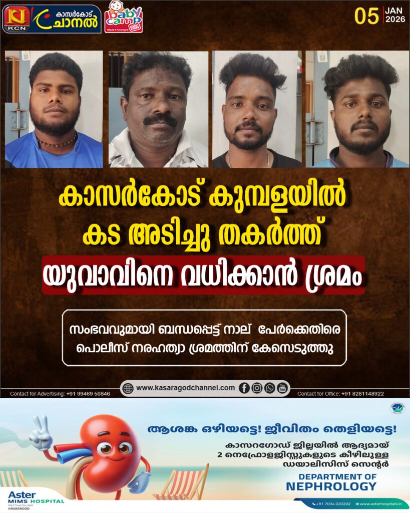 സംഭവവുമായി ബന്ധപ്പെട്ട് നാല് പേര്ക്കെതിരെ പൊലീസ് നരഹത്യാ ശ്രമത്തിന് കേസെടുത്തു. കുമ്പള പേരാലിലെ കടയാണ് ആക്രമിച്ചത്. പേരാലിലെ ബി.എം. റിഫായിയെ ആക്രമിച്ചെന്ന പരാതിയില് കുമ്പള പൊലീസാണ് നരഹത്യാ