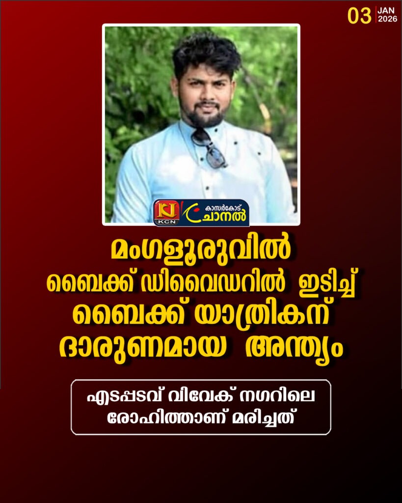 എടപ്പടവ് വിവേക്നഗറിലെ രോഹിത്താണ് മരിച്ചത് മംഗളൂരു:ഗഞ്ചിമാത് ഗ്രാമപഞ്ചായത്ത് പരിധിയിലെ ദേശീയപാതയില് രാജ് അക്കാദമിക്കും നിര്മ്മാണത്തിലിരിക്കുന്ന ടോള് ഗേറ്റിനും സമീപം ബൈക്ക് ഡിവൈഡറില് ഇടിച്ച് 27 കാരനായ ബൈക്ക്