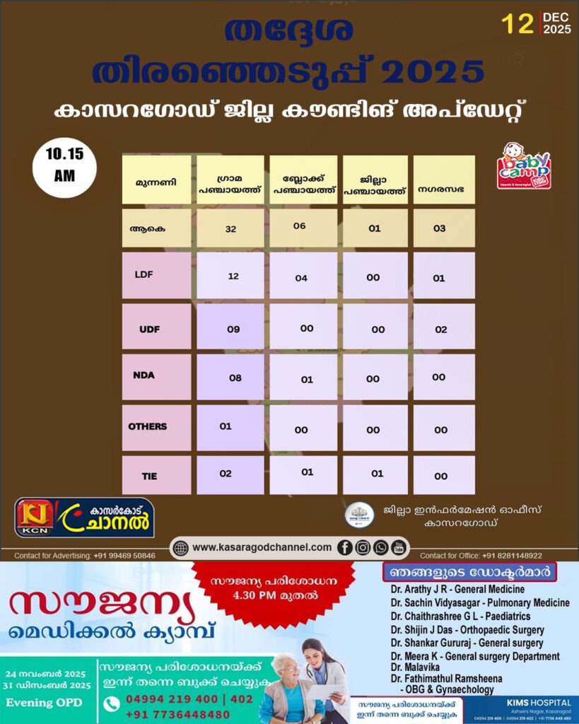തദ്ദേശ തെരഞ്ഞെടുപ്പ്: കാസര്കോട് നഗരസഭ 1-ാം വാര്ഡ് ചേരങ്കൈ വെസ്റ്റ് യു ഡി എഫ് സ്ഥാനാര്ത്ഥി തഷ്രീഫ ബഷീര് വിജയിച്ചു