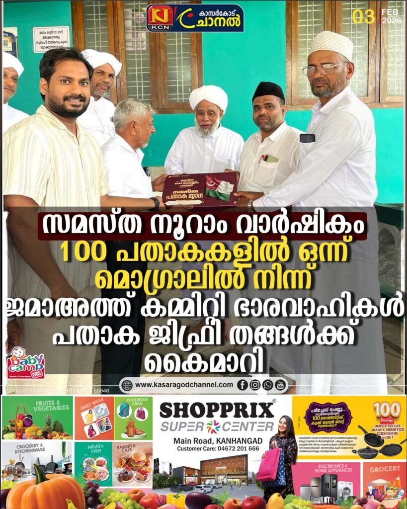 വരക്കല്. ഐതിഹാസികമായ സമസ്ത കേരള ജംഇയ്യത്തുല് ഉലമ നൂറാം വാര്ഷിക അന്താരാഷ്ട്ര മഹാ സമ്മേളന നഗരിയില് ഉയര്ത്താനുള്ള 100 പതാകകളില് ഒന്ന് മൊഗ്രാല് ജമാഅത്തില് നിന്ന്. മൊഗ്രാല്