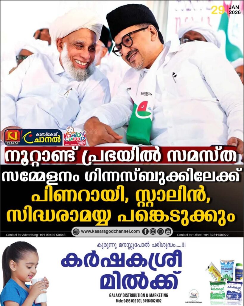 കുണിയ (കാസര്കോട്): കുണിയയില് സമസ്ത നൂറാം വാര്ഷിക അന്താരാഷ്ട്ര മഹാസമ്മേളനത്തിന് വിപുലമായ ഒരുക്കം. മൂന്നുദിവസത്തെ പ്രതിനിധി ക്യാമ്പില് 33,313 പേര് മുഴുവന്സമയവും പങ്കെടുക്കും. ഇതോടെ ഏറ്റവും കൂടുതലാളുകള്