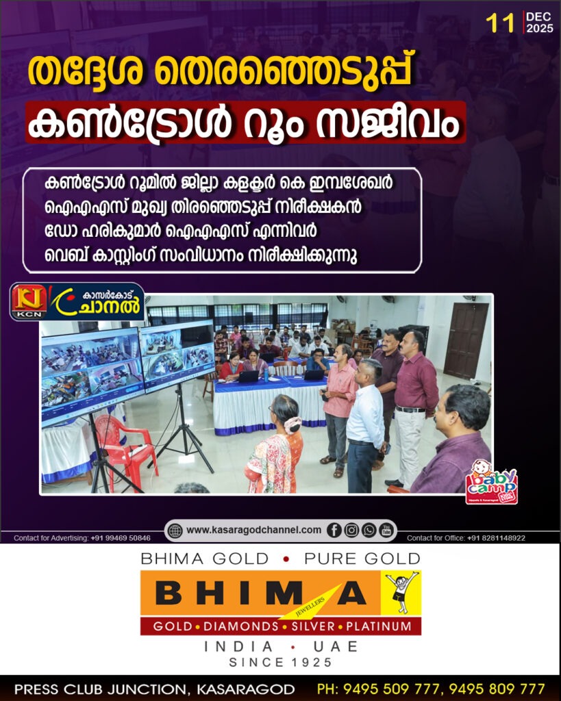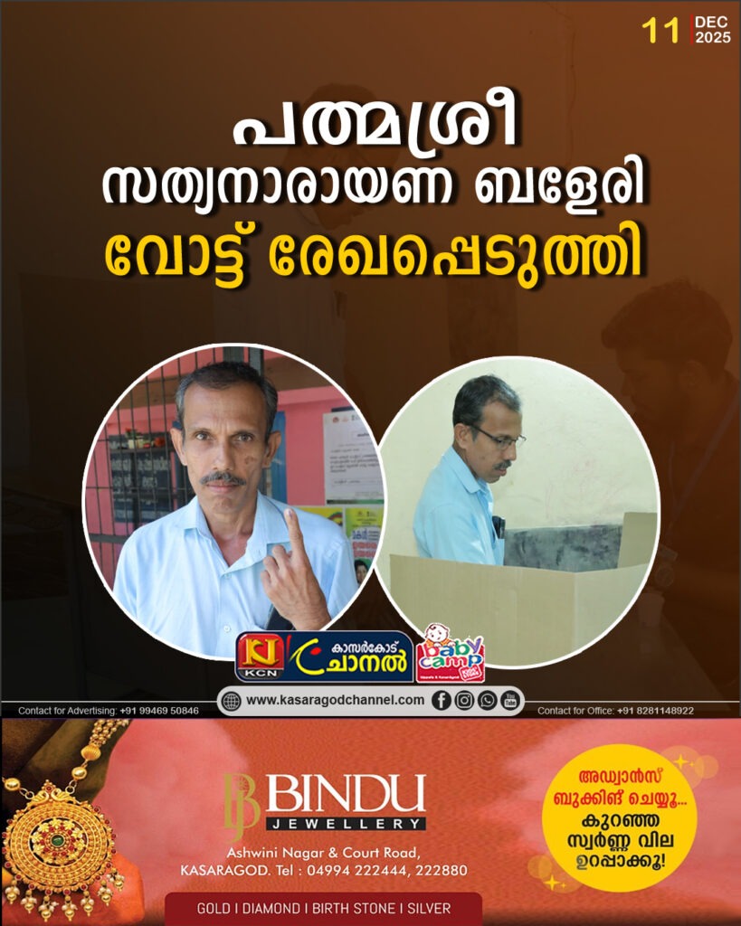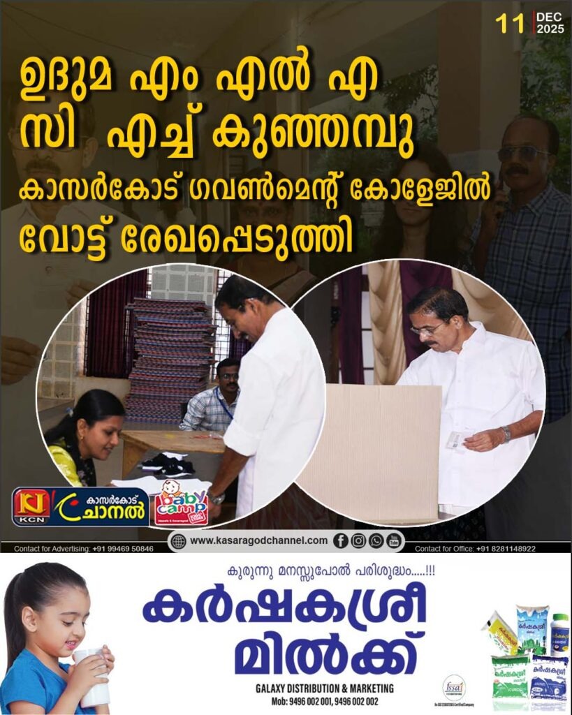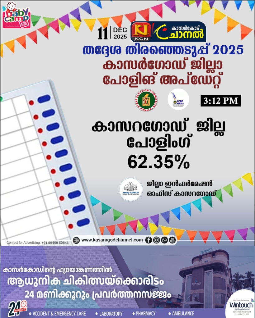 തദ്ദേശ തിരഞ്ഞെടുപ്പ്, 2025ജില്ല അപ്ഡേറ്റ്സ്ജില്ല ഇന്ഫര്മേഷന് ഓഫീസ്,കാസര്കോട് 2025, ഡിസംബര് 11 ജില്ലയില് പോളിംഗ് – ഉച്ചയ്ക്ക് 12 15വരെ ജില്ലയില് നിലവില് 466282പേര് വോട്ട് രേഖപ്പെടുത്തി.