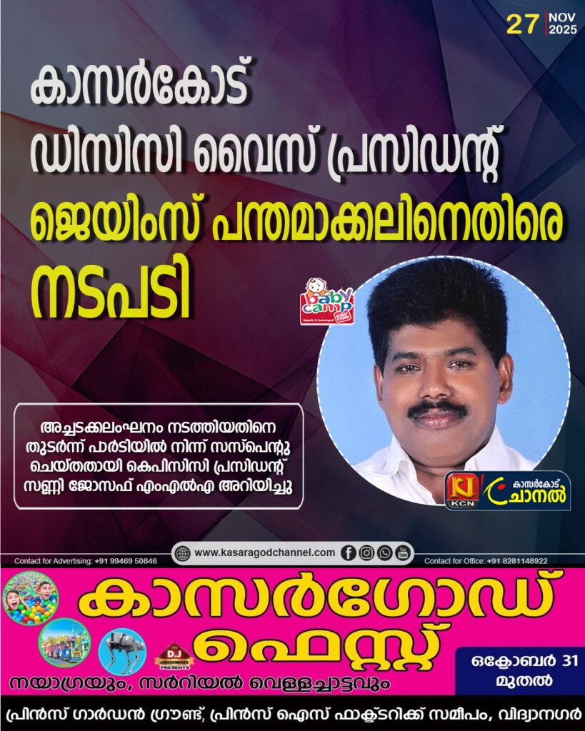 അച്ചടക്കലംഘനം നടത്തിയതിനെ തുടര്ന്ന് പാര്ടിയില് നിന്ന് സസ്പെന്റു ചെയ്തതായി കെപിസിസി പ്രസിഡന്റ് സണ്ണി ജോസഫ് എംഎല്എ അറിയിച്ചു. കഴിഞ്ഞ ദിവസം ഡിസിസി പ്രസിഡന്റ് പി കെ ഫൈസലിനെതിരെ