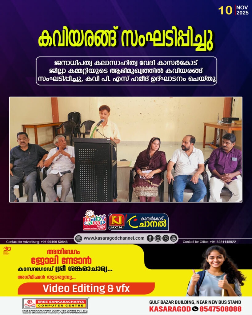 കാസര്കോട്: ജനാധിപത്യ കലാസാഹിത്യ വേദി കാസര്കോട് ജില്ലാ കമ്മറ്റിയുടെ ആഭിമുഖ്യത്തില് കവിയരങ്ങ് സംഘടിപ്പിച്ചു. കവി പി. എസ് ഹമീദ് ഉദ്ഘാടനം ചെയ്തു. ഡോ. എം.എ.മുംതാസ് അധ്യക്ഷത വഹിച്ചു.
