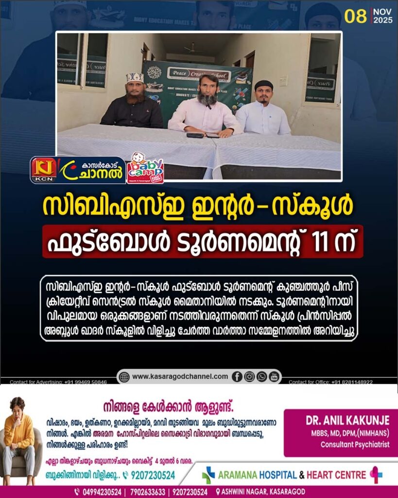 മഞ്ചേശ്വരം: സിബിഎസ്ഇ ഇന്റര്-സ്കൂള് ഫുട്ബോള് ടൂര്ണമെന്റ് കുഞ്ചത്തൂര് പീസ് ക്രിയേറ്റീവ് സെന്ട്രല് സ്കൂള് മൈതാനിയില് നടക്കും. ടൂര്ണമെന്റിനായി വിപുലമായ ഒരുക്കങ്ങളാണ് നടത്തിവരുന്നതെന്ന് സ്കൂള് പ്രിന്സിപ്പല് അബ്ദുള് ഖാദര്