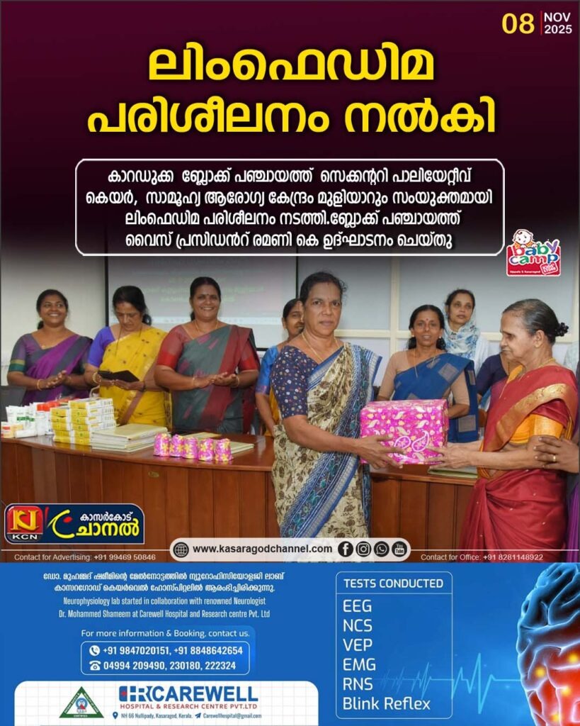 ബോവിക്കാനം:-കാറഡുക്ക ബ്ലോക്ക് പഞ്ചായത്ത് _ സെക്കന്ററി പാലിയേറ്റീവ് കെയര്, സാമൂഹ്യ ആരോഗ്യ കേന്ദ്രം മുളിയാറും സംയുക്തമായി ലിംഫെഡിമ പരിശീലനം നടത്തി.ബ്ലോക്ക് പഞ്ചായത്ത് വൈസ് പ്രസിഡന്റ് രമണി കെ