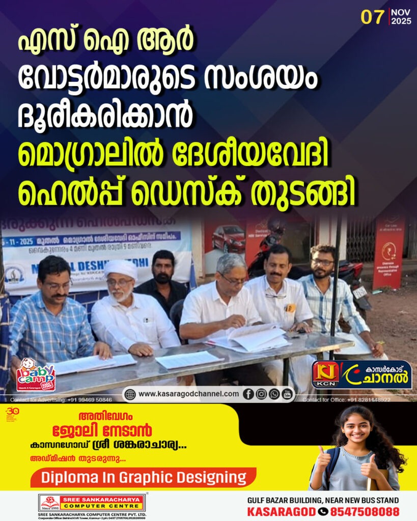 മൊഗ്രാല്.എസ് ഐ ആറിന്റെ ഭാഗമായി വോട്ടര് പട്ടിക പരിഷ്കരിക്കുന്നതിന്റെ എന്യൂമറേഷന് ഫോമുകള് പൂരിപ്പിക്കേണ്ടതില് വോട്ടര്മാര്ക്കുണ്ടായിട്ടുള്ള ആശങ്കയും, സംശയങ്ങളും ദൂരീകരിക്കാന് മൊഗ്രാല് ദേശീയവേദി മൊഗ്രാലില് ഹെല്പ്പ് ഡെസ്ക് ആരംഭിച്ചു.