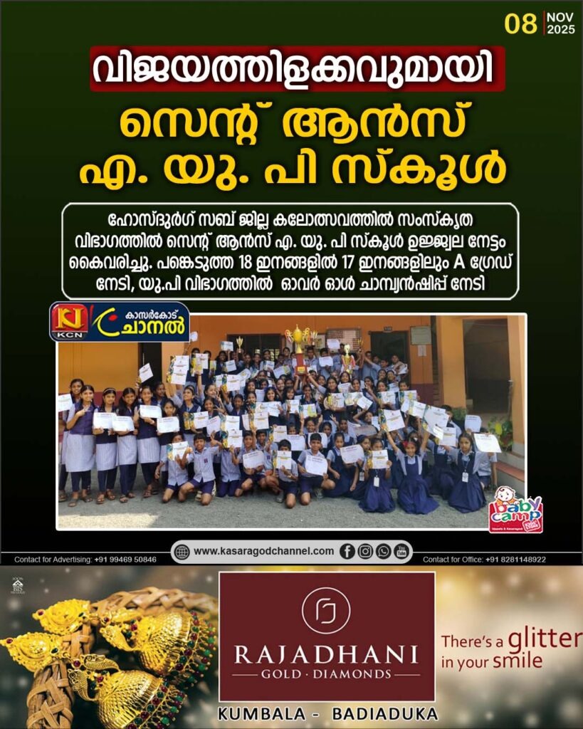 നീലേശ്വരം: ഹോസ്ദുര്ഗ് സബ് ജില്ല കലോത്സവത്തില് സംസ്കൃത വിഭാഗത്തില് സെന്റ് ആന്സ് എ. യു. പി സ്കൂള് ഉജ്ജ്വല നേട്ടം കൈവരിച്ചു. പങ്കെടുത്ത 18 ഇനങ്ങളില് 17 […]