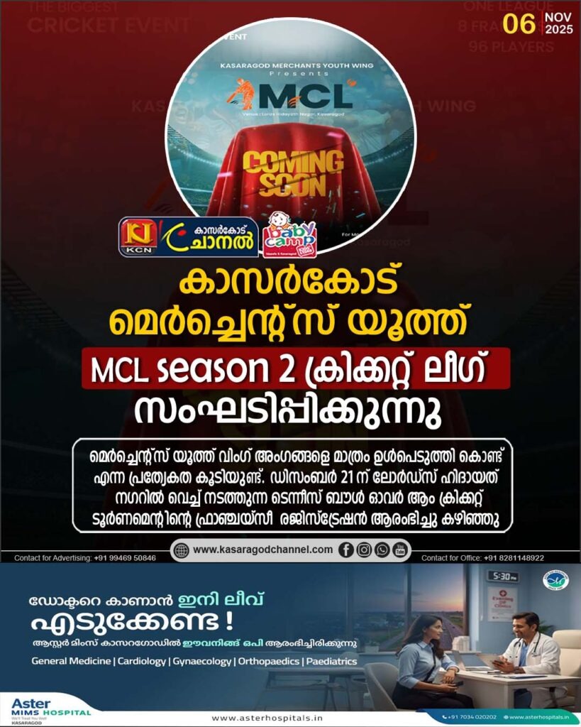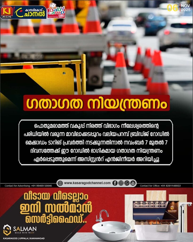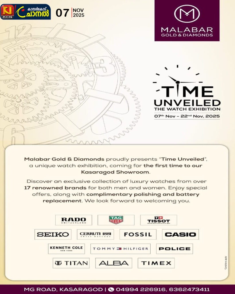 മലബാർ ഗോൾഡ് & ഡയമണ്ട്സ് കാസർഗോഡ് ഷോറൂമിൽ ആദ്യമായി ബ്രാൻ്റഡ് വാച്ചുകളുടെ പ്രീമിയം എക്സിബിഷൻ ‘ടൈം അൺവെയ്ൽഡ്’ ഷോറൂം ഉദ്ഘാടനം ഇന്ന് (നവംബർ 7) 4മണിക്ക് നടക്കും