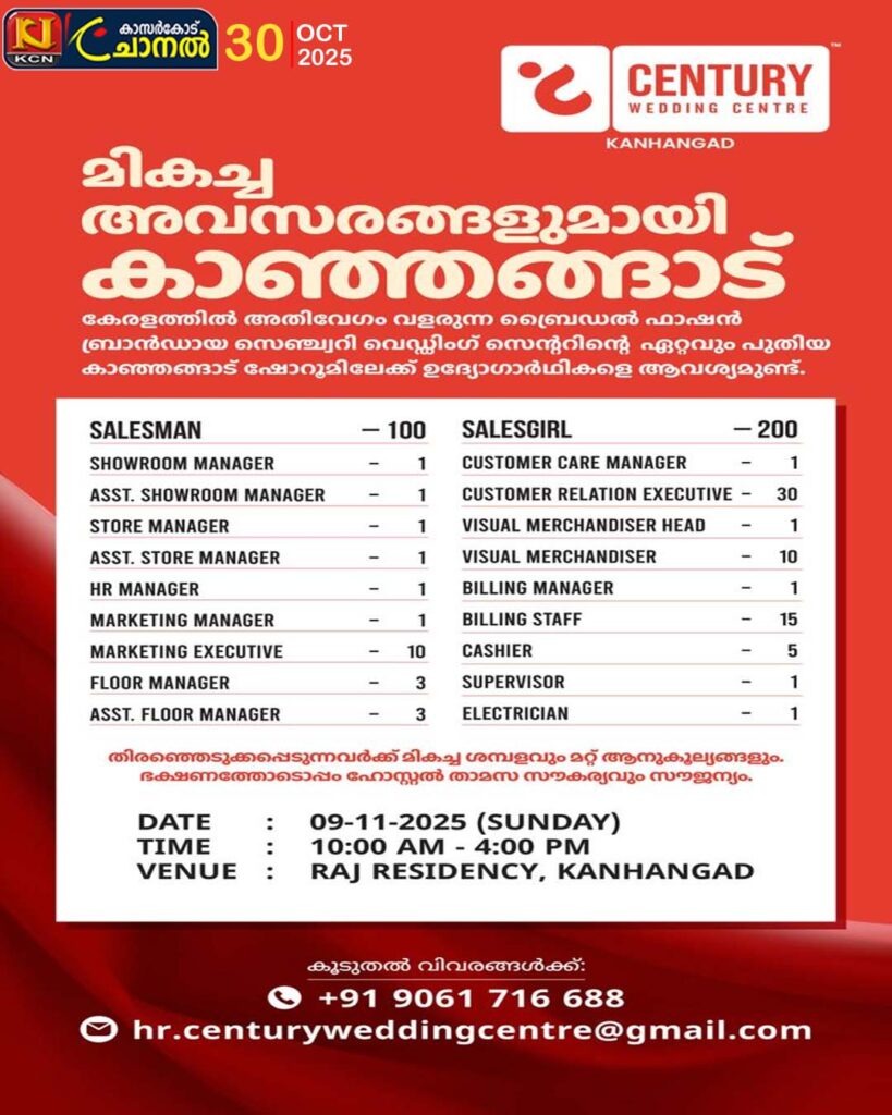 കേരളത്തില് അതിവേഗം വളരുന്ന ബ്രൈഡല് ഫാഷന് ബ്രാന്ഡായ സെഞ്ചുറി വെഡ്ഡിംഗ് സെന്ററിന്റെ ഏറ്റവും പുതിയ കാഞ്ഞങ്ങാട് ഷോറൂമിലേക്ക് ഉദ്യോഗാര്ഥികളെ ആവശ്യമുണ്ട് തിരഞ്ഞെടുക്കുന്നവര്ക്ക് മികച്ച ശമ്പളവും മറ്റ് ആനുകൂല്യങ്ങളും. […]