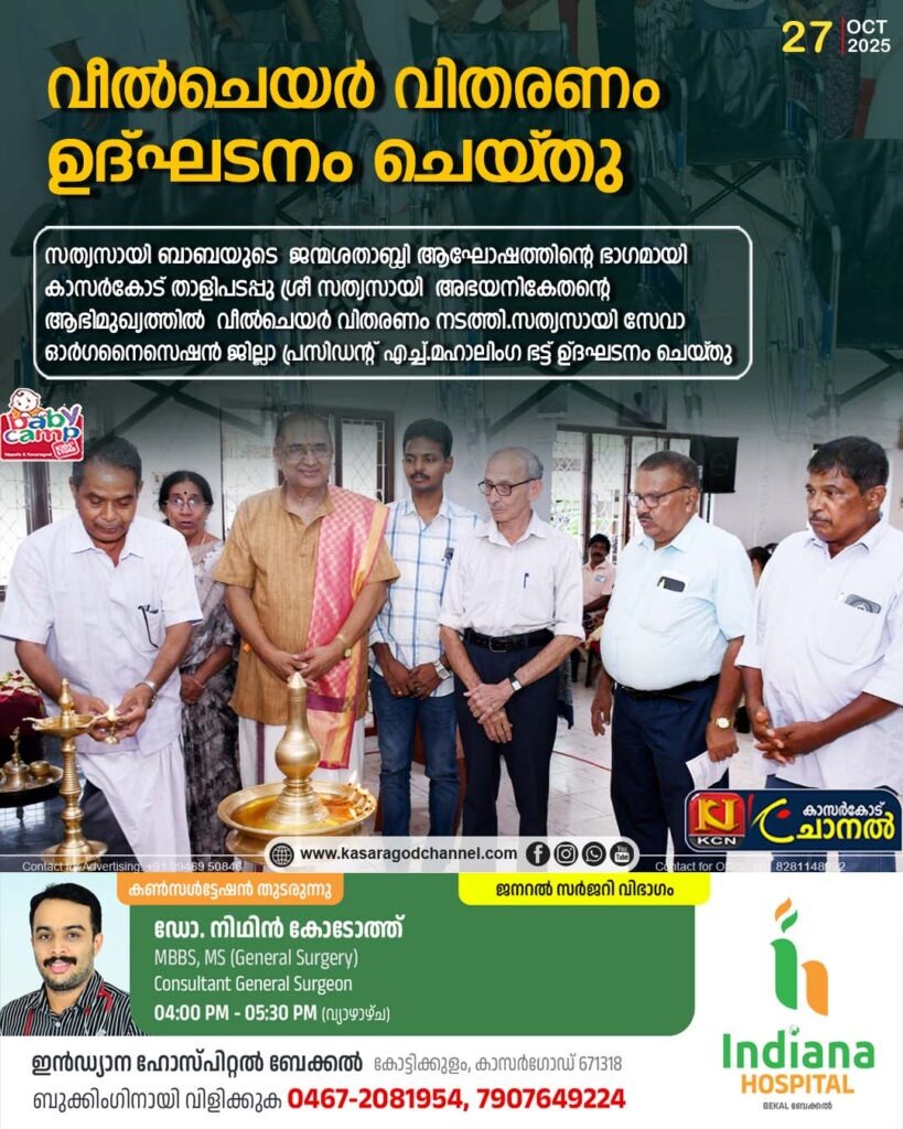സത്യസായി ബാബയുടെ ജന്മശതാബ്ധി ആഘോഷത്തിന്റെ ഭാഗമായി കാസര്കോട്് താളിപടപ്പു ശ്രീ സത്യസായി അഭയനികേതന്ന്റെ ആഭിമുഖ്യത്തില് വീല്ചെയര് വിതരണം നടത്തി. പരിപാടി സത്യസായി സേവാ ഓര്ഗനൈസെഷന് ജില്ലാ പ്രസിഡന്റ് […]