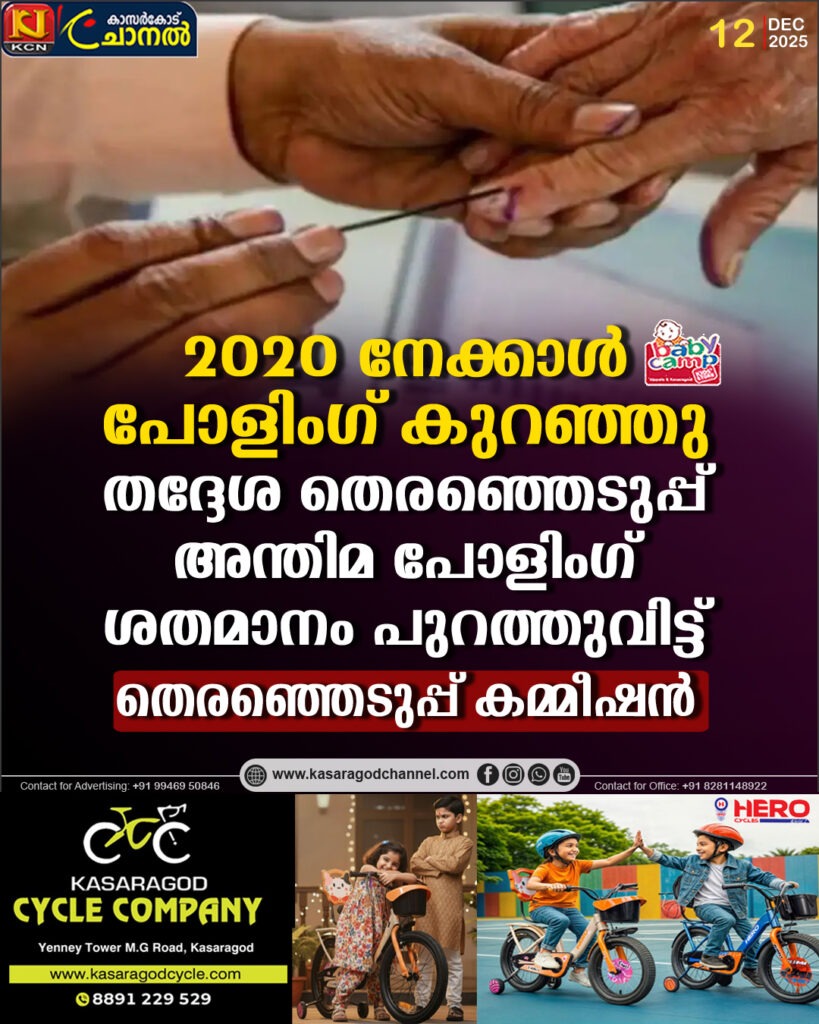 ഏറ്റവും കൂടുതല് പോളിംഗ് രേഖപ്പെടുത്തിയത് വയനാട് ജില്ലയിലാണ്. കുറവ് പത്തനംതിട്ട ജില്ലയിലുംതിരുവനന്തപുരം: സംസ്ഥാനത്ത് രണ്ട് ഘട്ടങ്ങളിലായി നടന്ന തദ്ദേശ തെരഞ്ഞെടുപ്പിലെ അന്തിമ പോളിംഗ് കണക്ക് പുറത്ത് വന്നു.