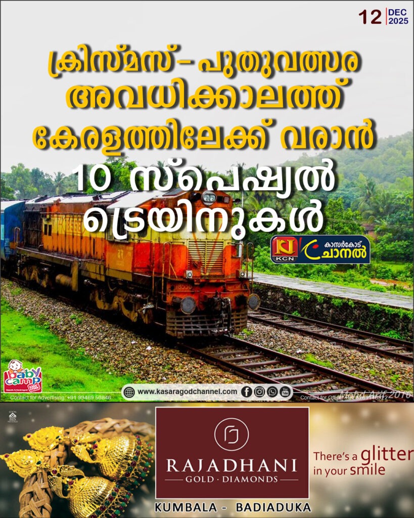 തിരുവനന്തപുരം: ക്രിസ്മസ്-പുതുവത്സര അവധിക്കാലത്ത് കേരളത്തിലേക്ക് വരാന് ട്രെയിന് ടിക്കറ്റ് ലഭിക്കാത്തവര്ക്ക് സന്തോഷ വാര്ത്ത. കേരളത്തിലേക്ക് 10 സ്പെഷ്യല് ട്രെയിനുകള് കേന്ദ്ര റെയില്വേ മന്ത്രാലയം അനുവദിച്ചു. ഈ ട്രെയിനുകള്