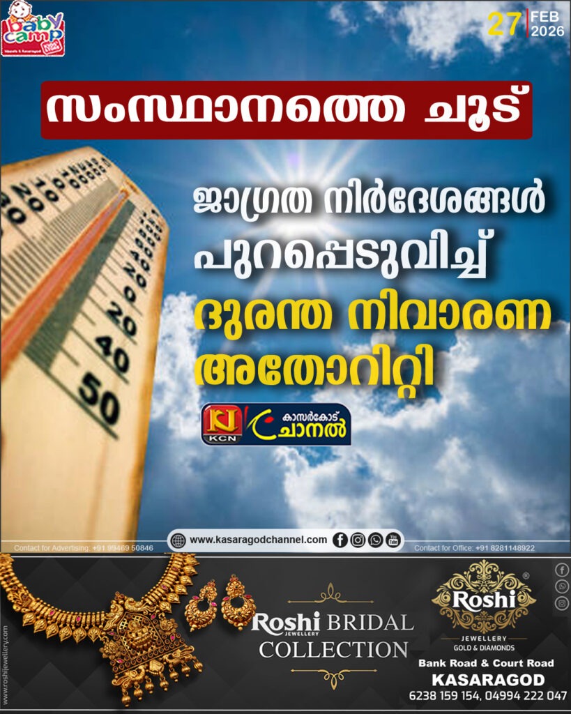 പൊതുവെ ചൂട് വര്ധിച്ചു വരുന്ന സാഹചര്യത്തില് പൊതുജനങ്ങള്ക്കായി സംസ്ഥാന ദുരന്ത നിവാരണ അതോറിറ്റി പുറപ്പെടുവിക്കുന്ന ജാഗ്രത നിര്ദേശങ്ങള്.* ഉയര്ന്ന ചൂട് സൂര്യാഘാതം, സൂര്യാതപം, നിര്ജലീകരണം തുടങ്ങി നിരവധി