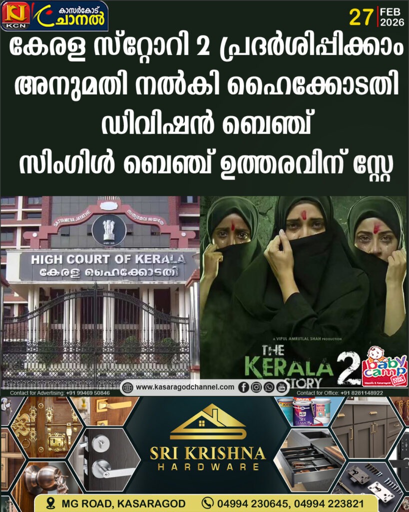 കേരള സ്റ്റോറി 2 പ്രദര്ശിപ്പിക്കാം; അനുമതി നല്കി ഹൈക്കോടതി ഡിവിഷന് ബെഞ്ച്; സിംഗിള് ബെഞ്ച് ഉത്തരവിന് സ്റ്റേ എറണാകുളം: കേരള സ്റ്റോറി 2 പ്രദര്ശനത്തിന് അനുമതി നല്കി
