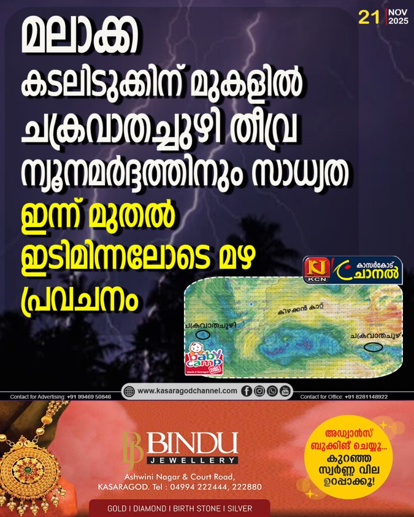 മലാക്ക കടലിടുക്കിന് മുകളില് ചക്രവാതച്ചുഴി, തീവ്ര ന്യൂനമര്ദ്ദത്തിനും സാധ്യത; ഇന്ന് മുതല് ഇടിമിന്നലോടെ മഴ, പ്രവചനം