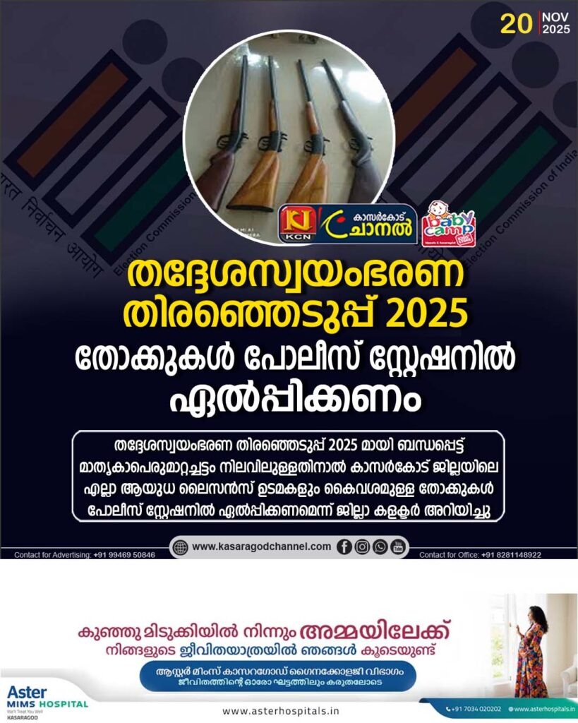 തദ്ദേശസ്വയംഭരണ തിരഞ്ഞെടുപ്പ് 2025;തോക്കുകള് പോലീസ് സ്റ്റേഷനില് ഏല്പ്പിക്കണം