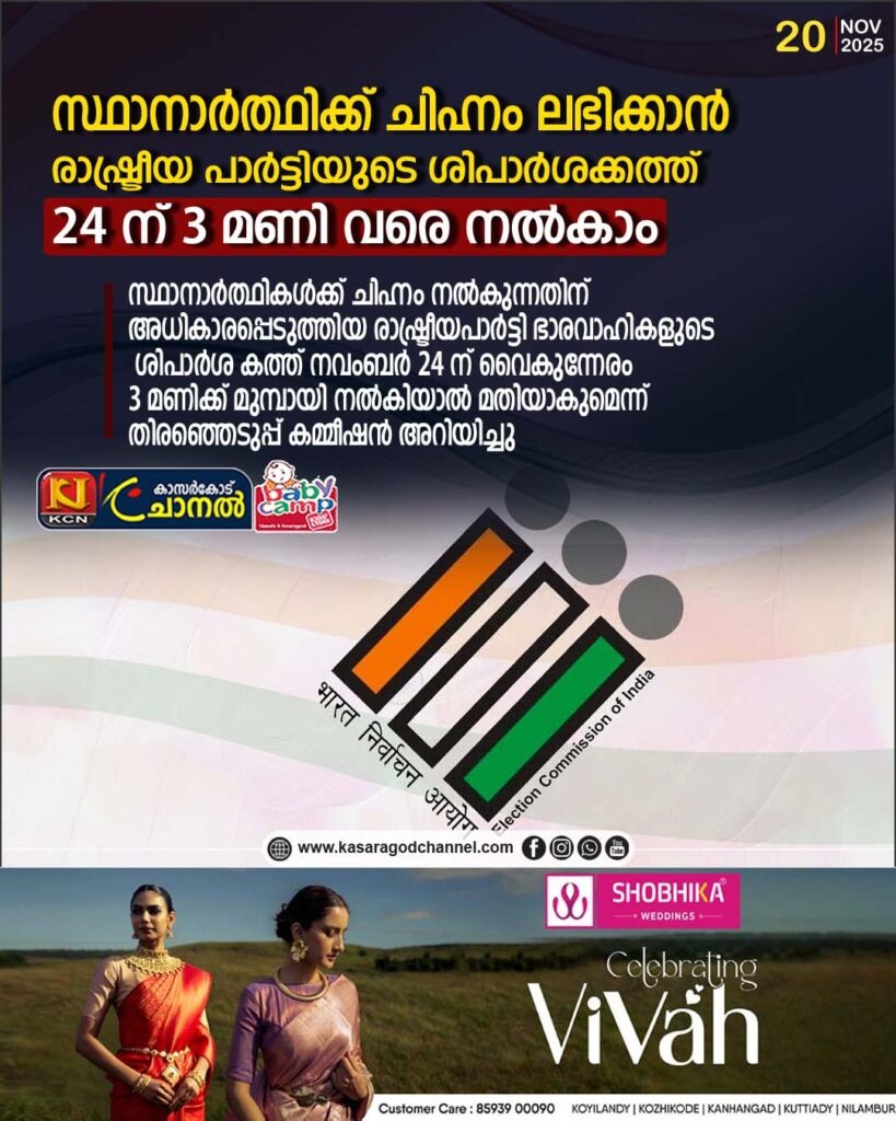 തദ്ദേശസ്വയംഭരണ തിരഞ്ഞെടുപ്പ് 2025 മായി ബന്ധപ്പെട്ട് മാതൃകാപെരുമാറ്റച്ചട്ടം നിലവിലുള്ളതിനാല് കാസര്ഗോഡ് ജില്ലയിലെ എല്ലാ ആയുധ ലൈസന്സ് ഉടമകളും കൈവശമുള്ള തോക്കുകള് പോലീസ് സ്റ്റേഷനില് ഏല്പ്പിക്കണമെന്ന് ജില്ലാ കളക്ടര് […]
