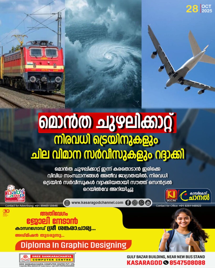 വിശാഖപട്ടണം: മൊന്ത ചുഴലിക്കാറ്റ് ഇന്ന് കരതൊടാന് ഇരിക്കെ വിവിധ സംസ്ഥാനങ്ങള് അതീവ ജാഗ്രതയില്. നിരവധി ട്രെയിന് സര്വീസുകള് റദ്ദാക്കിയതായി സൗത്ത് സെന്ട്രല് റെയില്വേ അറിയിച്ചു. പാസഞ്ചര് ട്രെയിനുകളും
