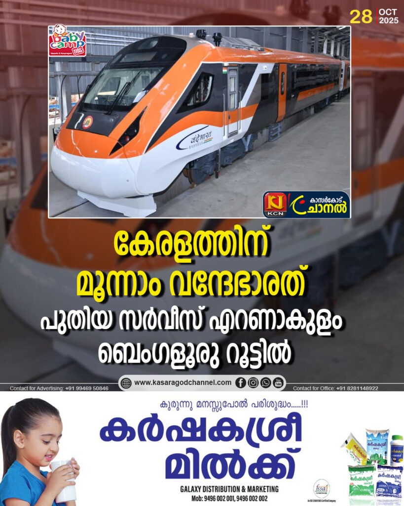 തിരുവനന്തപുരം: എറണാകുളം- ബെംഗളൂരു റൂട്ടില് പുതിയ വന്ദേഭാരത് ട്രെയിന് അനുവദിക്കുമെന്നു കേന്ദ്രമന്ത്രി അശ്വിനി വൈഷ്ണവ് അറിയിച്ചതായി ബിജെപി സംസ്ഥാന അധ്യക്ഷന് രാജീവ് ചന്ദ്രശേഖര്. നവംബര് പകുതിയോടെ സര്വീസ്