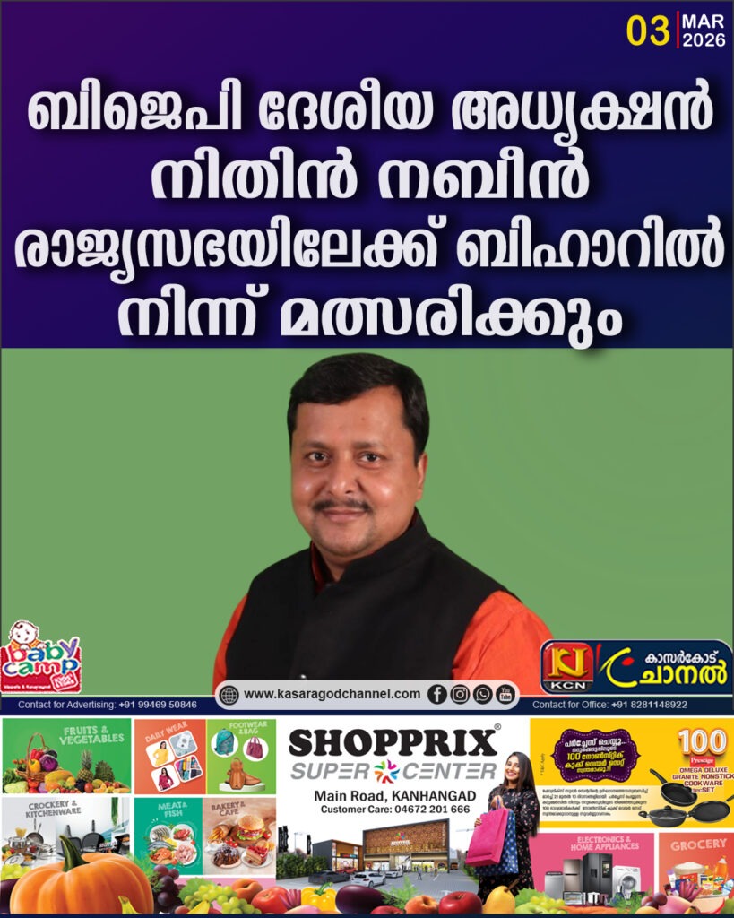 ബിജെപി ദേശീയ അധ്യക്ഷന്‍ നിതിന്‍ നബീന്‍ രാജ്യസഭയിലേക്ക്; ബിഹാറില്‍ നിന്ന് മത്സരിക്കും ന്യൂ ഡല്‍ഹി: ബിജെപി ദേശീയ അധ്യക്ഷന്‍ നിതിന്‍ നബീനെ രാജ്യസഭയിലേക്ക് പരിഗണിച്ച് ബിജെപി. ബിഹാറില്‍