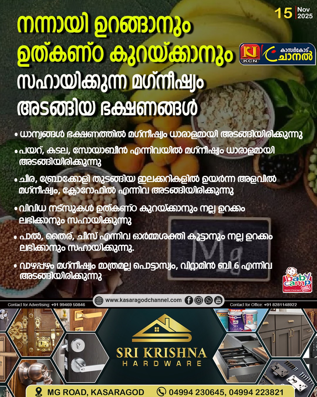 ധാന്യങ്ങള് ഭക്ഷണത്തില് മഗ്നീഷ്യം ധാരാളമായി അടങ്ങിയിരിക്കുന്നു