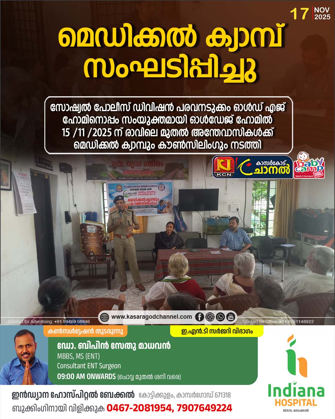 സോഷ്യല് പോലീസ് ഡിവിഷന് പരവനടുക്കം ഓള്ഡ് എജ് ഹോമുനൊപ്പം സംയുക്തമായി ഓള്ഡേജ് ഹോമില് 15 /11 /2025ന് രാവിലെ മുതല് അന്തേവാസികള്ക്ക് മെഡിക്കല് ക്യാമ്പും കൗണ്സിലിംഗും നടത്തി. 44 അന്തേവാസികള് മെഡിക്കല് ക്യാമ്പിലും കൗണ്സിലിങ്ങിലും പങ്കെടുത്തു. ഡോക്ടര് ഗോകുല് ജി നായര് അന്തേവാസികളെ പരിശോധിച്ചു. മെഡിക്കല് ക്യാമ്പ് അഡീഷണല് എസ്പിശ്രീ സി എം ദേവദാസന് ഉദ്ഘാടനം ചെയ്തു. ഓള്ഡ് എജ് ഹോമിലെ ആയുര്വേദ ഡോക്ടര് ശ്രീമതി ദിവ്യ സ്വാഗതം പറഞ്ഞു.