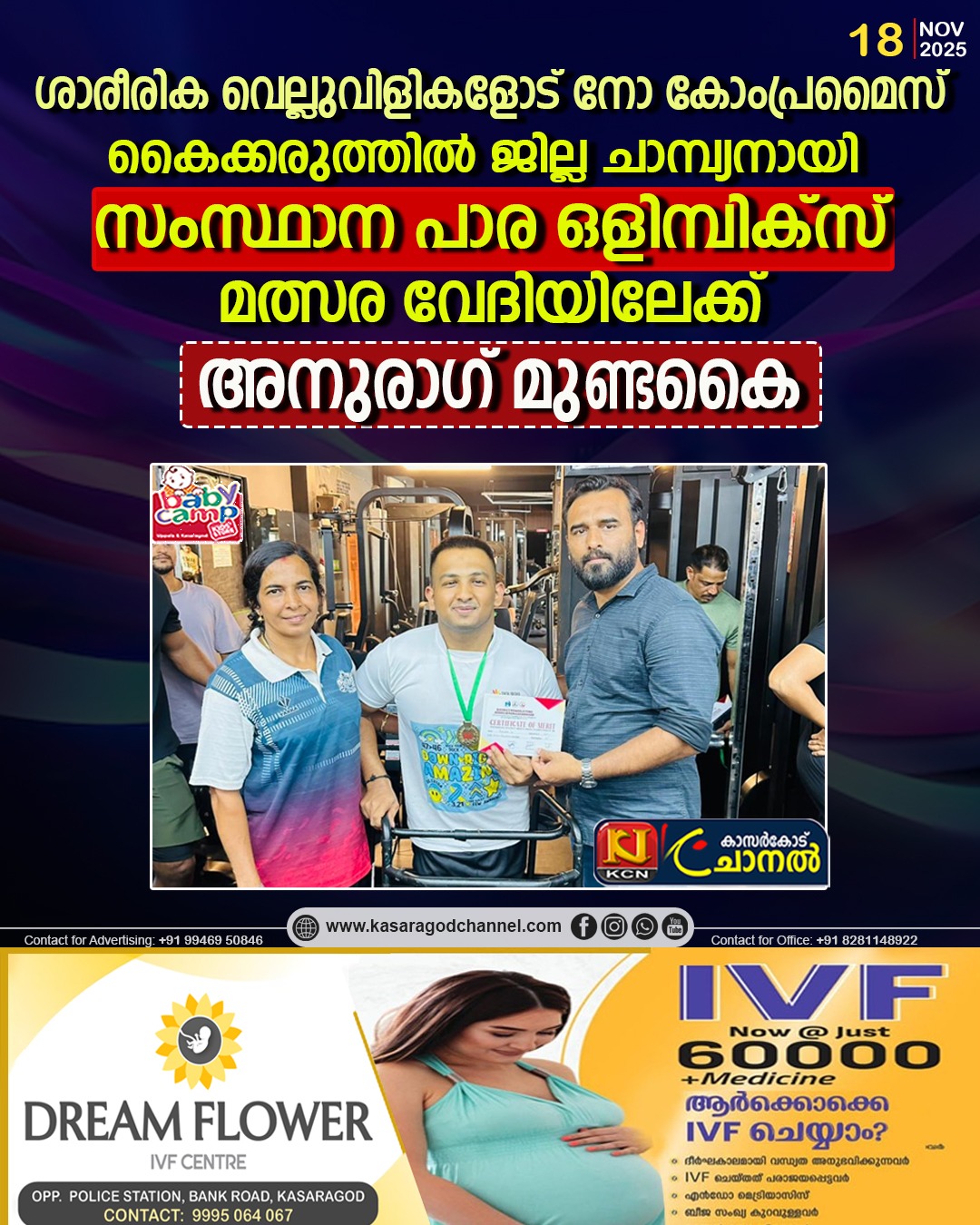 ബോവിക്കാനം : ജന്മനാ സെറിബ്രല് പാള്സി എന്ന ബുദ്ധിമുട്ടിനോട് പൊരുതി ജില്ലയില് നിന്നുള്ള ആദ്യത്തെ പാരാ ഒളിമ്പിക് ബെഞ്ച് പ്രസ്സ് ചാമ്പ്യനായി അനുരാഗ് മുണ്ടക്കെ.