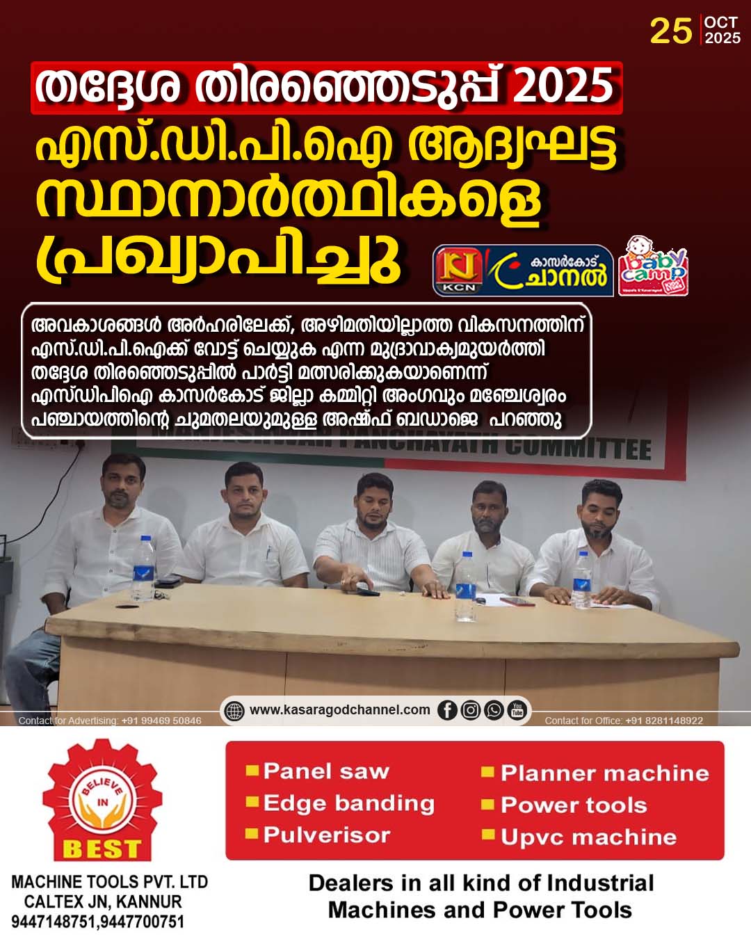 മഞ്ചേശ്വരം ഗ്രാമ പഞ്ചായത്തില് മത്സരിക്കുന്ന സ്ഥാനാര്ത്ഥികളുടെ ആദ്യഘട്ട പട്ടിക അദ്ദേഹം വാര്ത്താസമ്മേളനത്തില് പ്രഖ്യാപിച്ചു. പാര്ട്ടി മഞ്ചേശ്വരം മണ്ഡലം പ്രസിഡന്റ് ശരീഫ് പാവൂര് മച്ചംപാടി വാര്ഡിലും മണ്ഡലം ഓര്ഗനൈസര് യഹ്കൂബ് ഹൊസങ്കടി കജയിലും ജനവിധി തേടും. പഞ്ചായത്ത് കമ്മിറ്റീ അംഗം ഹാരിസ് ഉദ്യാവരം കുണ്ടുകൊള്കയിലും എസ്.ഡി.പി.ഐ പിന്തുണയില് സ്വതന്ത്ര സ്ഥാനാര്ത്ഥിയായി അബൂബക്കര് സിദീഖ് എന്ന റൈഷാദ് ഉദ്യാവരം ഗുത്തു വാര്ഡില് നിന്നും ജനവിധി നേടും.