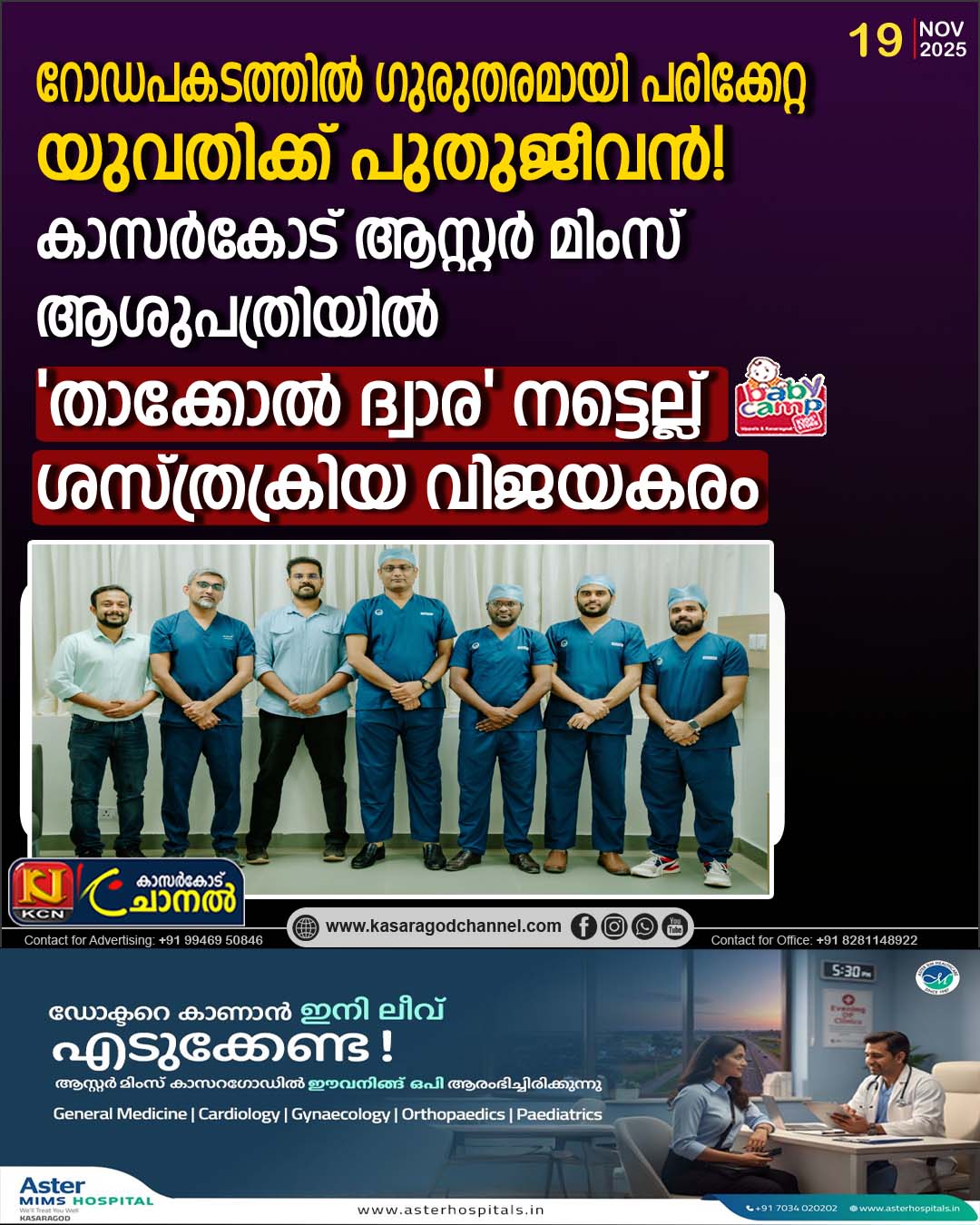കാസര്ഗോഡ്: റോഡപകടത്തില് ഗുരുതരമായ നട്ടെല്ലിന് പൊട്ടലേറ്റ യുവതിക്ക് കാസര്ഗോഡ് അസ്റ്റര് മിംസ് ആശുപത്രിയില് നടത്തിയ കീഹോള് ശസ്ത്രക്രിയ വിജയകരമായി പൂര്ത്തിയാക്കി. വലിയ മുറിവുകളോ വേദനയോ ഇല്ലാതെ ചുരുങ്ങിയ സമയത്തിനുള്ളില് തന്നെ രോഗിയെ സാധാരണ ജീവിതത്തിലേക്ക് തിരികെ കൊണ്ടുവരാന് ഈ നൂതന ചികിത്സാ രീതിക്ക് സാധിച്ചു.