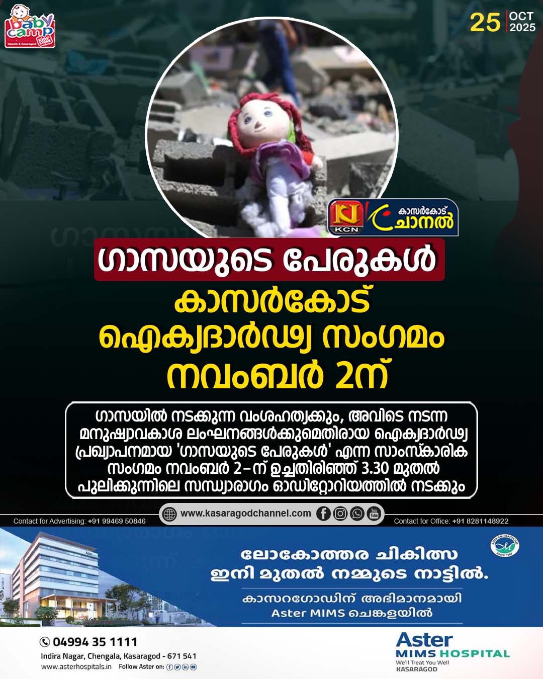 ചിന്ത രവി ഫൗണ്ടേഷന്റെ ആഭിമുഖ്യത്തില്, ഗാസയില് കൊല്ലപ്പെട്ട 18,000 നിരപരാധി കുട്ടികളുടെ പേരുകള് വായിക്കുന്ന സംസ്ഥാനതല പരിപാടിയായ ‘ഗാസയുടെ പേരുകള്’ എന്ന സംഗമത്തിന്റെ കാസര്കോട് പതിപ്പാണ് ഇവിടെ അരങ്ങേറുന്നത്.