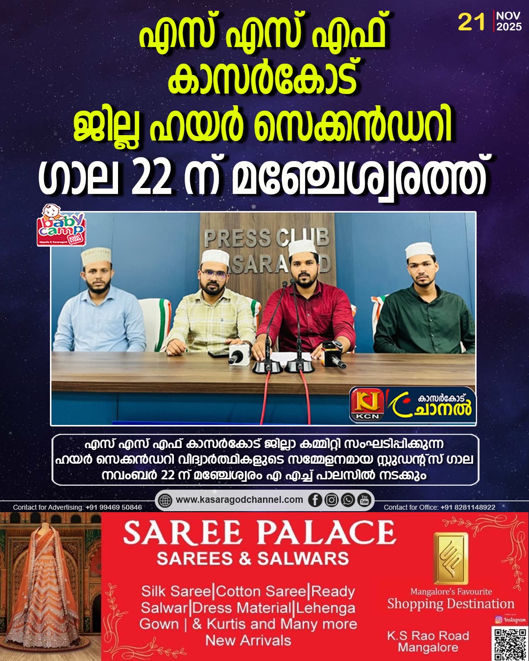 എസ് എസ് എഫ് കാസര്കോട് ജില്ലാ കമ്മിറ്റി സംഘടിപ്പിക്കുന്ന ഹയര് സെക്കന്ഡറി വിദ്യാര്ത്ഥികളുടെ സമ്മേളനമായ സ്റ്റുഡന്റ്സ് ഗാല നവംബര് 22 ന് മഞ്ചേശ്വരം എ എച്ച് പാലസില് നടക്കും.