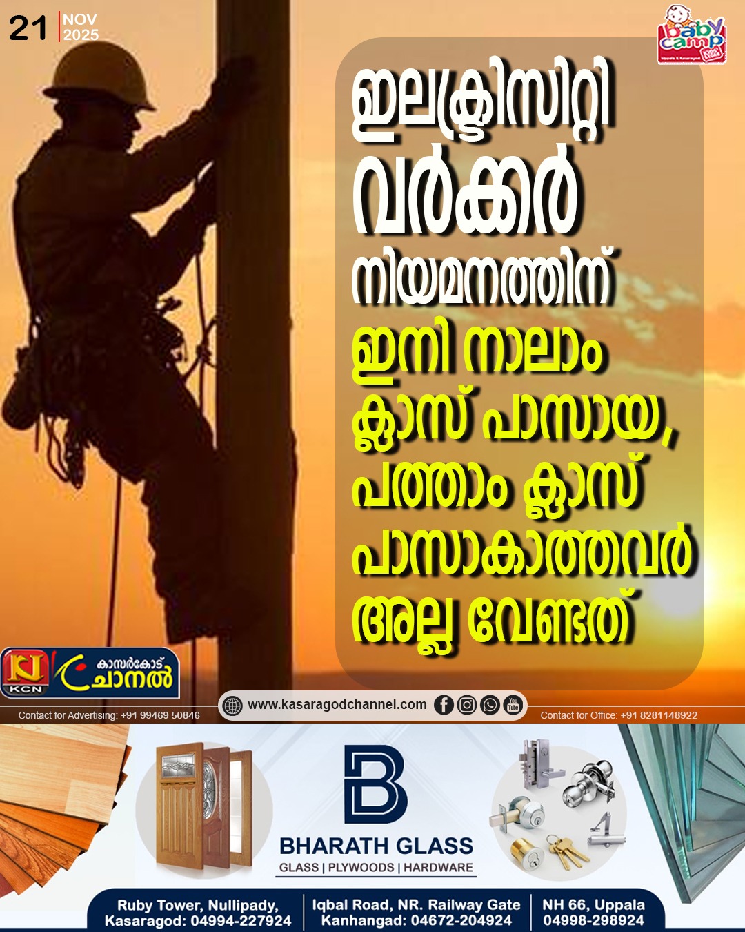 ഇലക്ട്രിസിറ്റി വര്ക്കര് നിയമനത്തിന് ഇനി നാലാം ക്ലാസ് പാസായ, പത്താം ക്ലാസ് പാസാകാത്തവരെ നിയമിച്ചിരുന്ന രീതി മാറ്റിയാണ് പുതിയ രീതി നിശ്ചയിച്ചത്.