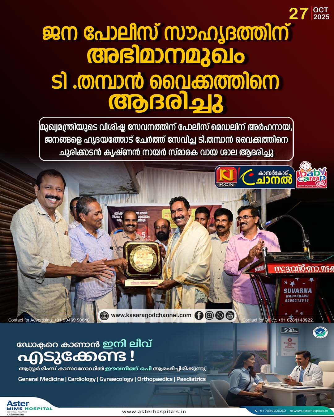 തൃക്കരിച്ചൂര് : ബഹു:മുഖ്യമന്ത്രിയുടെ വിശിഷ്ട സേവനത്തിന് പോലീസ് മെഡലിന് അര്ഹനായ, ജനങ്ങളെ ഹൃദയത്തോട് ചേര്ത്ത് സേവിച്ച ടി.തമ്പാന് വൈക്കത്തിനെ ചൂരിക്കാടന് കൃഷ്ണന് നായര് സ്മാരക വായ ശാല ആദരിച്ചു. സി.പി.ഐ ദേശീയ കൗണ്സില് അംഗം ഗോവിന്ദന് പള്ളിക്കാപ്പില് പൗരാവലിയുടെ സാക്ഷ്യത്തില് അദ്ദേഹത്തെ പൊന്നാടയണിച്ച് ആദരിച്ചു. ചടങ്ങില് ഗ്രന്ഥശാല താലൂക്ക് കൗണ്സില് അംഗം സി. സന്തോഷ്കുമാര് ചാലില് അദ്ധ്യക്ഷതവഹിച്ചു. 1958 ല് പോലീസില് കയറിയ ഇദ്ദേഹം 27 വര്ഷത്തോളം ജനക്ഷേമ പോലീസിന്റെ മുഖമായി സേവനം അനുഷ്ഠിച്ചു. ബേക്കല് ടൂറിസം പോലീസ്, ചന്തേര ജനമൈത്രി പബ്ലിക്ക് റിലേഷന് ഓഫീസര് , കാസര്ഗോഡ് സി.ഐ ഓഫീസ്, ബദിയഡുക്ക സ്റ്റേഷന്, , ജില്ലാ സ്പെഷ്യല് ബ്രാഞ്ച്, എന്നീ നിലകളില് സ്തുത്യര്ഹ സേവനം നിര്വ്വഹിച്ചു. നിലവില് കാസര്ഗോഡ് ജില്ലയുടെ എസ്.പി സി അസിസ്റ്റന്റ് നോഡല് ഓഫീസറായി ജോലി ചെയ്തു വരുന്നു. ചടങ്ങില് പി. കുഞ്ഞമ്പു അനുസ്മരണത്തിന്റെ ഭാഗമായി സംഘടിപ്പിച്ച ആദരിക്കല് ചടങ്ങില് സി.പി.ഐ ജില്ലാ സെക്രട്ടറി സി.പി. ബാബു സി.പി.ഐ മണ്ഡലം കമ്മിറ്റി അംഗം എം. ഗംഗാധരന് ഗ്രന്ഥശാല താലൂക്ക് വൈസ് പ്രസിഡണ്ട് വിജയരാജ് സി.വി. സി.പി ഐ തൃക്കരിപ്പൂര് ലോക്കല് സെക്രട്ടറി എം.പി. ബിജീഷ്, ഗ്രന്ഥശാല മുന് താലൂക്ക് കൗണ്സില് അംഗം സദാനന്ദന്, സി.പി ഐ മൈത്താണി ബ്രാഞ്ച് സെക്രട്ടറി സജീവന് എം.പി പിഎന്നിവര് ആശംസകള് അര്പ്പിച്ചു. ചടങ്ങില് ഗ്രന്ഥശാല സെക്രട്ടറി പി.രാജഗോപാലന് സ്വാഗതവും ഗ്രന്ഥശാല വൈസ് പ്രസിഡണ്ട് വി.എം മധുസൂദനന്നന്ദിയും പറഞ്ഞു.
