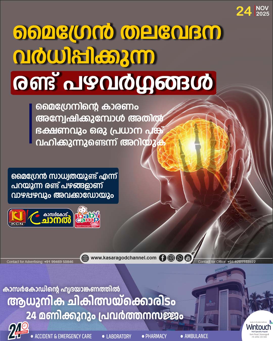 മൈഗ്രേന് ഉണ്ടാകാനുള്ള കാരണങ്ങള് പലതാണ്. അതിലൊന്നാണ് ഭക്ഷണത്തില് നിന്നുണ്ടാകുന്ന റിയാക്ഷനുകള്. നമ്മുടെ നിത്യജീവിതത്തില് ഉപയോഗിക്കുന്ന പല ഭക്ഷണ പദാര്ഥങ്ങളും മൈഗ്രേന് കാരണമാകാം. അത്തരത്തില് മൈഗ്രേന് സാധ്യതയുണ്ട് എന്ന് പറയുന്ന രണ്ട് പഴങ്ങളാണ് വാഴപ്പഴവും അവക്കാഡോയും. ഈ രണ്ട് പഴങ്ങളിലും ധാരാളം പോഷകങ്ങളും ആന്റീഓക്സിഡന്റുകളും ആരോഗ്യകരമായ കൊഴുപ്പുകളും അടങ്ങിയിട്ടുണ്ട്. വാഴപ്പഴം അമിതമായി പഴുക്കുമ്പോള് അതില് ഉയര്ന്ന അളവില് ടെറാമിന് ഉണ്ടാകുന്നു.അവക്കാഡോയിലെ ന്യൂറോട്രാന്സ്മിറ്റര് സന്തുലിതാവസ്ഥയെ ബാധിക്കുന്ന ഫിനോളിക് സംയുക്തങ്ങള് അടങ്ങിയിട്ടുണ്ട്. മൈഗ്രേന് പ്രശ്നങ്ങളുളള ആളുകളില് ടെറാമിനും ഫിനോളിക് സംയുക്തങ്ങളും തലച്ചോറിലെ രാസ സിഗ്നലുകളെ മാറ്റുന്നു. അതുകൊണ്ടാണ് ഈ പഴങ്ങള് കഴിക്കുമ്പോള് തലവേദന ഉണ്ടാകുന്നത്.