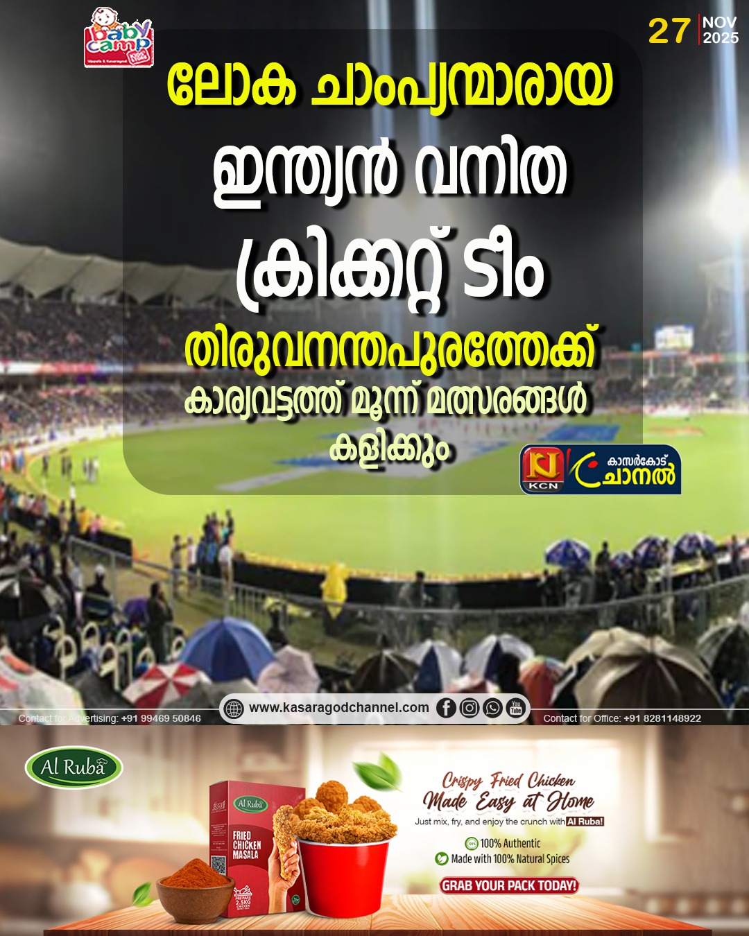 തിരുവനന്തപുരം: ലോക ചാംപ്യന്മാര് തിരുവനന്തപുരത്തേക്ക്. ഇന്ത്യന് വനിത ക്രിക്കറ്റ് ടീം ഡിസംബറില് കാര്യവട്ടം, ഗ്രീന്ഫീല്ഡ് സ്റ്റേഡിയത്തില് ശ്രീലങ്കയ്ക്കെതിരെ മൂന്ന് ട്വന്റി 20 മത്സരങ്ങള് കളിക്കും. ഡിസംബര് 26,28,30 ദിവസങ്ങളിലാണ് മത്സരങ്ങള്. പരമ്പരയില് ആകെ അഞ്ച് മത്സരങ്ങളാണുള്ളത്. ആദ്യ രണ്ട് മത്സരം വിശാഖപട്ടണത്ത് നടക്കും. ലോകകപ്പ് ജയത്തിന് ശേഷം ആദ്യ പരമ്പരയാണിത്. ഔദ്യോഗിക പ്രഖ്യാപനം ഇന്നുണ്ടാകുമെന്ന് കേരള ക്രിക്കറ്റ് അസോസിയേഷന് സെക്രട്ടറി വിനോദ് കുമാര് അറിയിച്ചു.