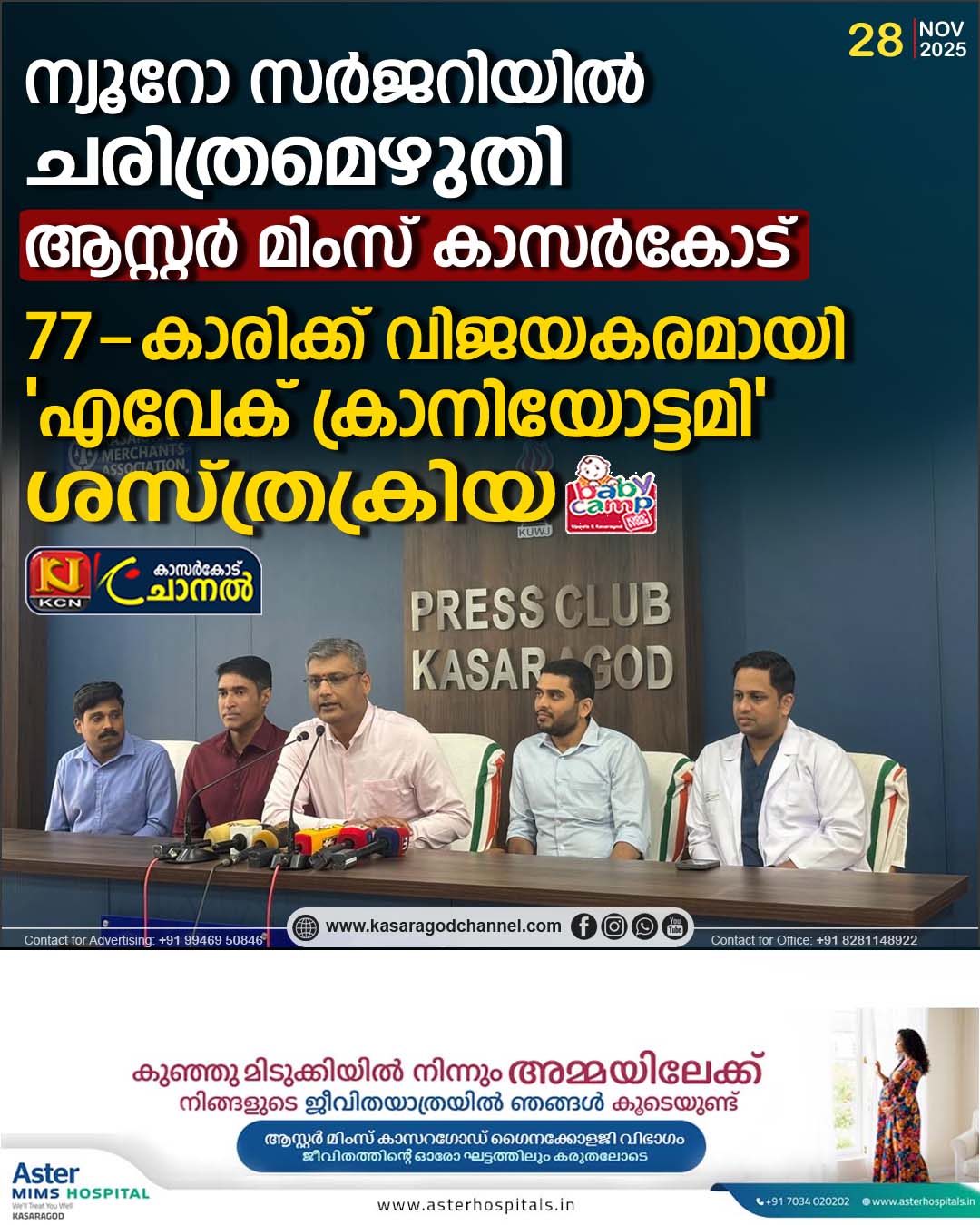 കാസര്ഗോഡ്: സാധാരണയായി മെട്രോ നഗരങ്ങളിലെ വലിയ ന്യൂറോ സര്ജറി കേന്ദ്രങ്ങളില് മാത്രം കണ്ടുവരുന്ന, അത്യന്തം സങ്കീര്ണ്ണമായ ‘എവേക് ക്രാനിയോട്ടമി’ (Awake Craniotomy) ശസ്ത്രക്രിയ ആസ്റ്റര് മിംസ് കാസര്ഗോഡ് വിജയകരമായി പൂര്ത്തിയാക്കിയതായി ആശുപത്രി സിഒഒ ഡോ. സോയ് ജോസഫ് വാര്ത്താ സമ്മേളനത്തില് അറിയിച്ചു. 77 വയസ്സുള്ള സ്ത്രീക്കാണ് ഈ ശസ്ത്രക്രിയയിലൂടെ ജീവന് രക്ഷിക്കുന്ന ചികിത്സ ലഭ്യമാക്കിയത്. ഇതോടെ കാസര്ഗോഡ് ജില്ലയിലെ ന്യൂറോസര്ജറി സേവനങ്ങള്ക്ക് ഒരു പുതിയ അധ്യായം തുറന്നിരിക്കുകയാണ്.