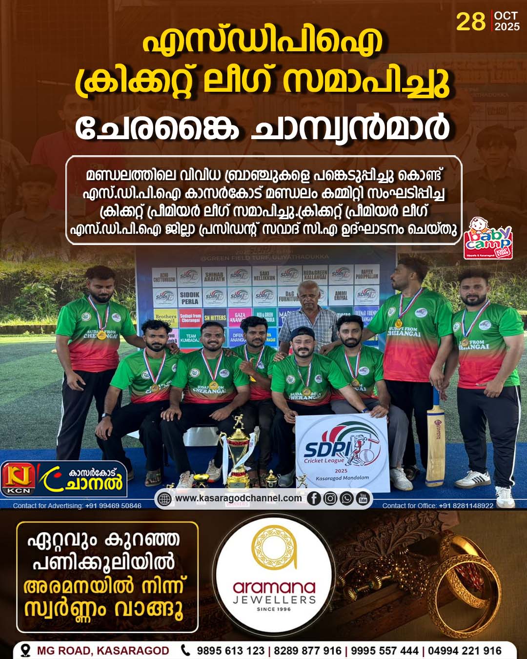 22 ടീമുകള് പങ്കെടുത്ത ക്രിക്കറ്റ് പ്രീമിയര് ലീഗില് ആവേശകരമായ 40 മത്സരങ്ങള്ക്കൊടുവില് സുഡാപി ഫ്രം ചേരങ്കൈ ചാമ്പ്യന്മാരായി. ഫൈനലില് ആര് & ജി നായിമാര്മൂലയെ 12 റണ്സിനാണ് ചേരങ്കൈ പരാജയപ്പെടുത്തിയത്.