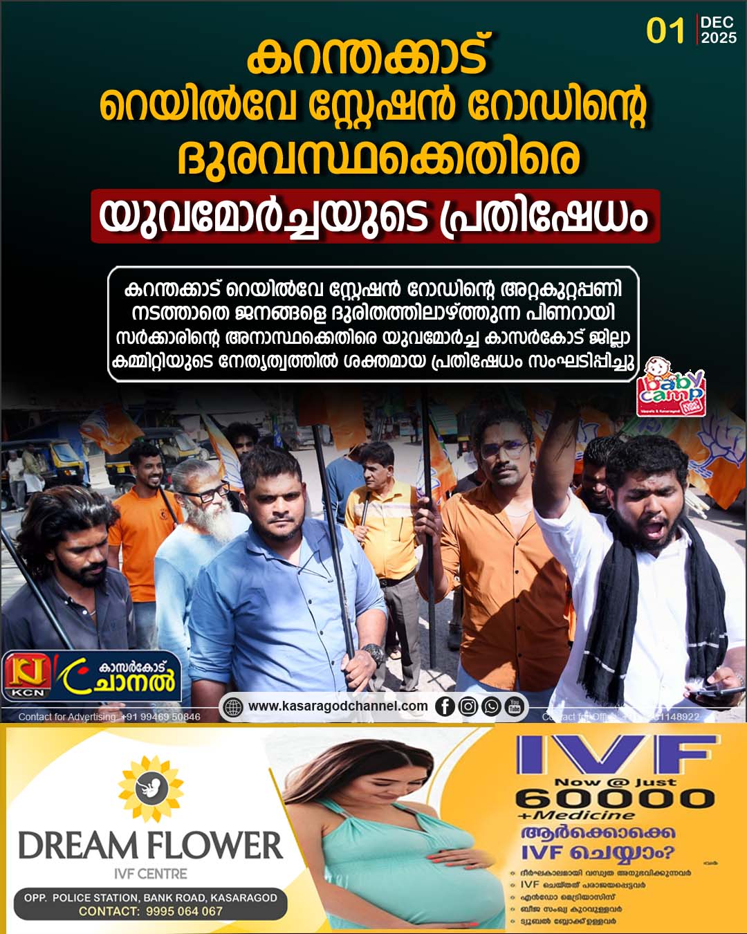 കറന്തക്കാട്- റെയില്വേ സ്റ്റേഷന് റോഡിന്റെ അറ്റകുറ്റപ്പണി നടത്താതെ ജനങ്ങളെ ദുരിതത്തിലാഴ്ത്തുന്ന പിണറായി സര്ക്കാരിന്റെ അനാസ്ഥക്കെതിരെ യുവമോര്ച്ച കാസറഗോഡ് ജില്ലാ കമ്മിറ്റിയുടെ നേതൃത്വത്തില് ശക്തമായ പ്രതിഷേധം സംഘടിപ്പിച്ചു.