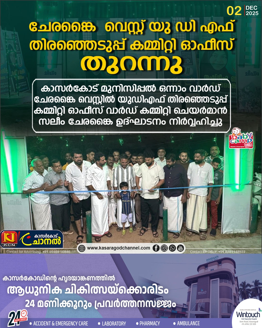 ചേരങ്കൈ : കാസര്കോട് മുനിസിപ്പല് ഒന്നാം വാര്ഡ് ചേരങ്കൈ വെസ്റ്റില് യുഡിഎഫ് തിരഞ്ഞെടുപ്പ് കമ്മിറ്റി ഓഫീസ് വാര്ഡ് കമ്മിറ്റി ചെയര്മാന് സലീം ചേരങ്കൈ ഉല്ഘാടനം നിര്വ്വഹിച്ചു.
