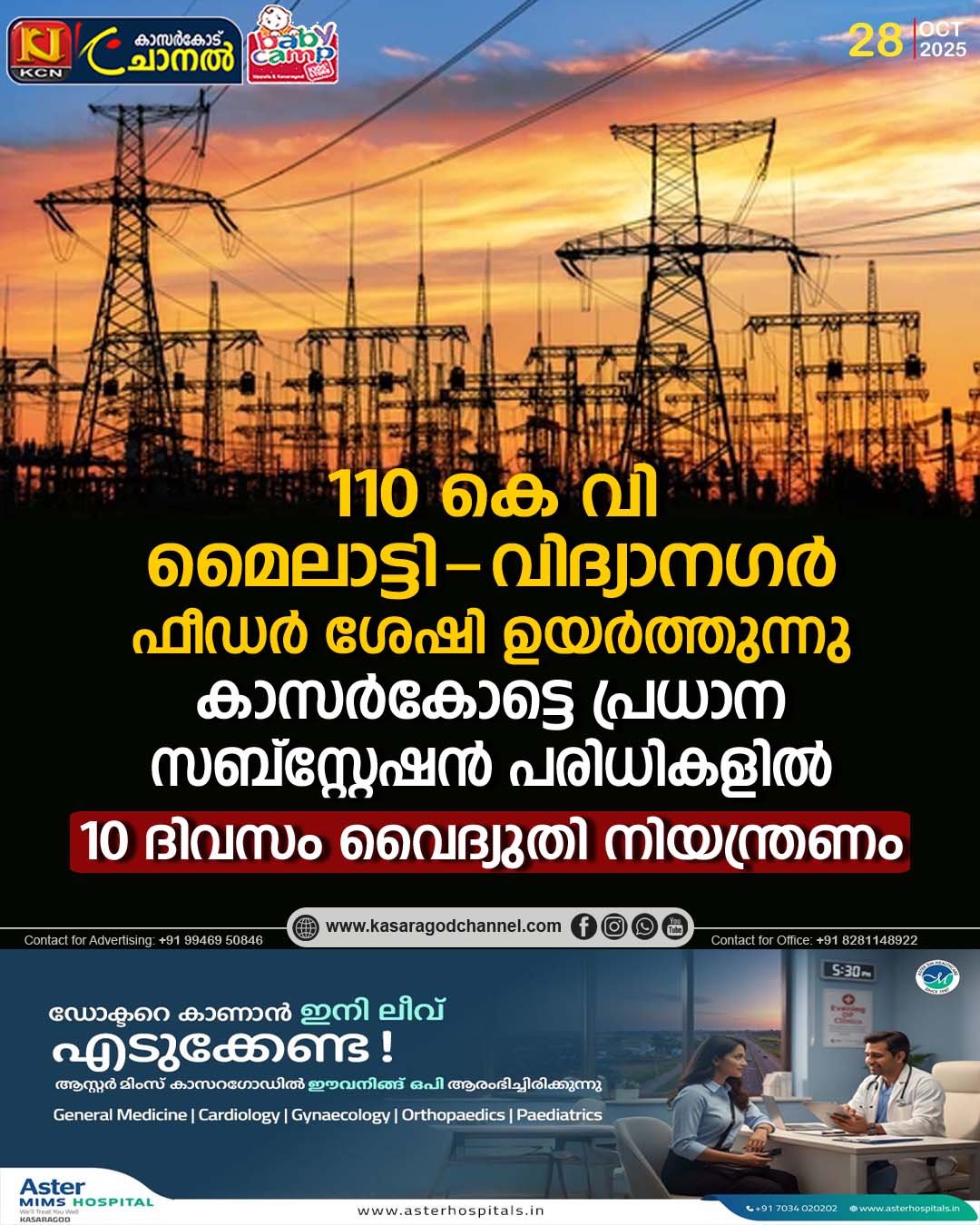 - 33 കെ.വി. സബ്സ്റ്റേഷനുകളായ അനന്തപുരം, കാസറഗോഡ് ടൗണ്, ബദിയടുക്ക, പെര്ള എന്നിവിടങ്ങളിലും വിതരണം ഭാഗികമായി നിലയ്ക്കും.
